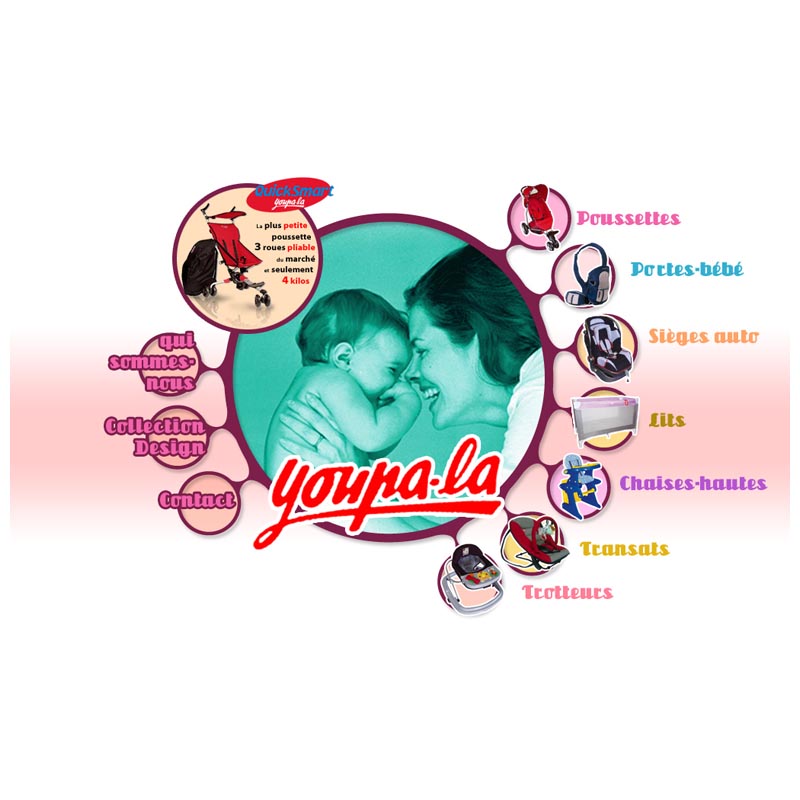 Youpa-la est un site de puériculture spécialisé dans les poussettes et les trotteurs. Orienté vers des produits très design, notre client souhaitait un site entièrement en flash avec une interface originale.