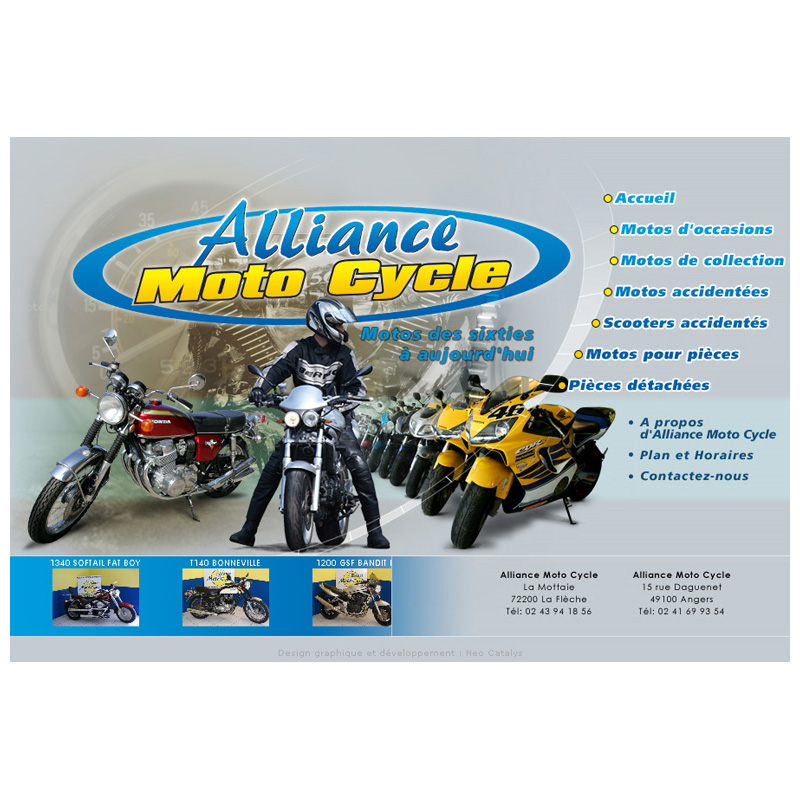 Site d'un concessionnaire moto spécialisé dans les motos de collection, présentant la société, la liste détaillée des véhicules d'occasion, ainsi qu'un module de commande de pièces détachées.