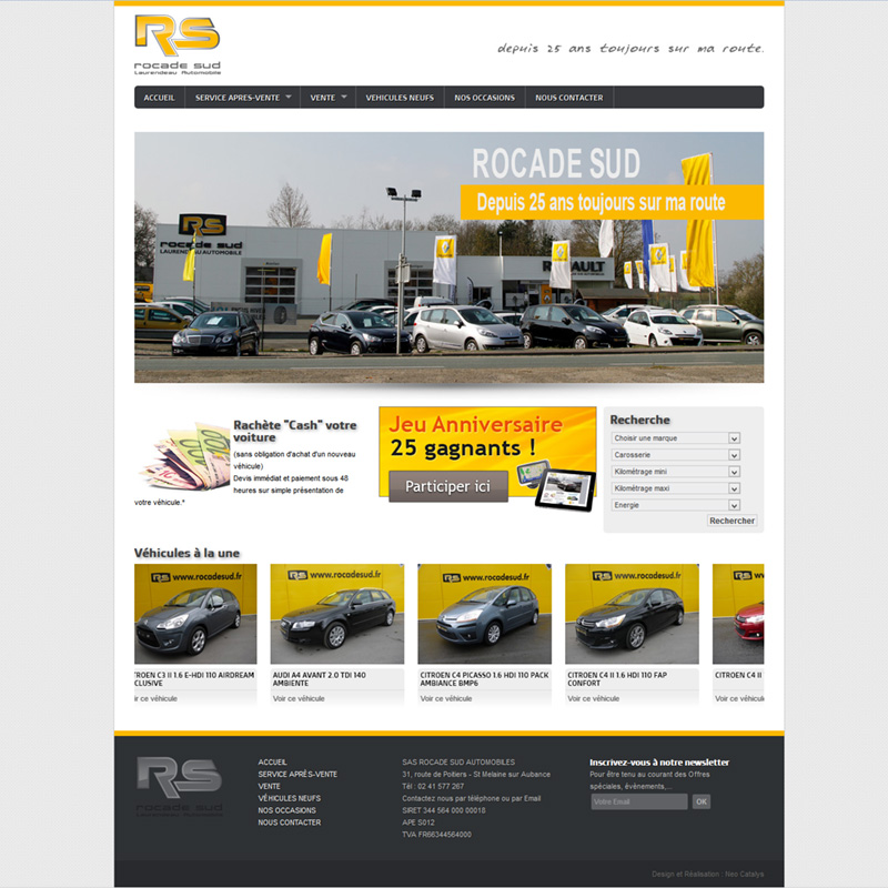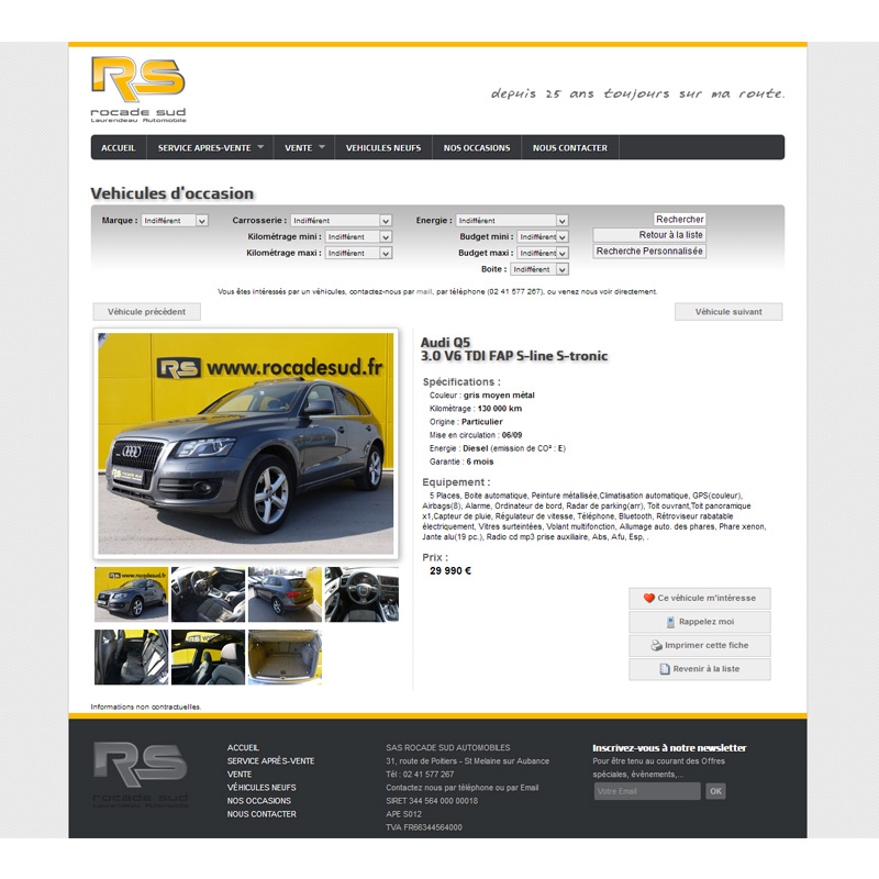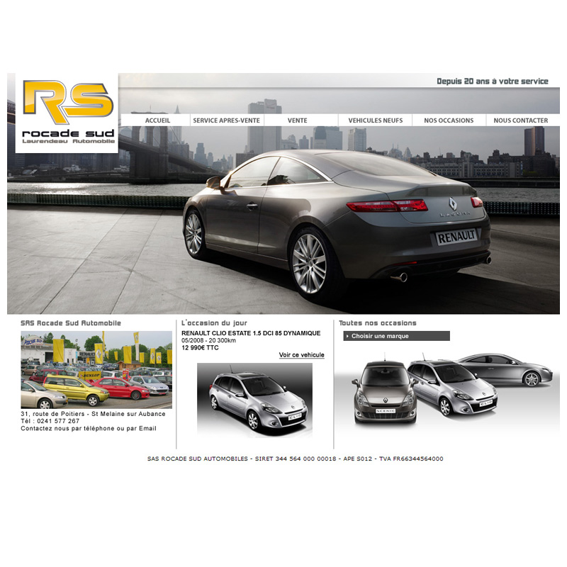 Site d'un concessionnaire automobile de la région d'Angers présentant la société, la liste détaillée des véhicules d'occasion, ainsi qu'un module de prise de rendez-vous en ligne. Le site permet de gérer de nombreux outils dont la gestion des véhicules d'occasion, lédition d'affiche par-brise, l'envoi automatisé de newsletter,...